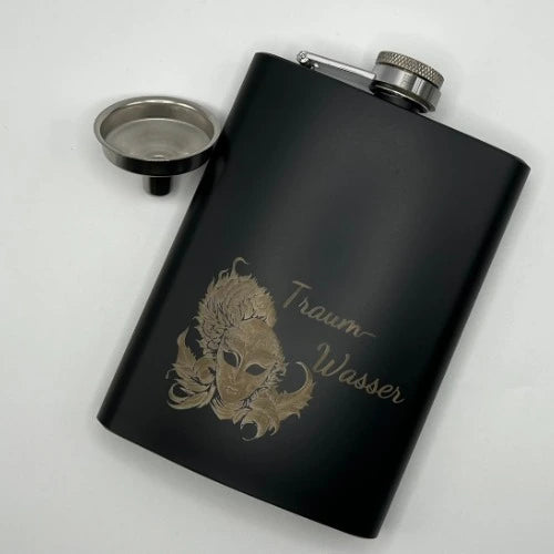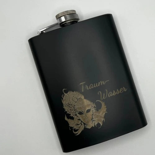 Edelstahl Flachmann Matt-Schwarz mit Lasergravur "Traumwasser"